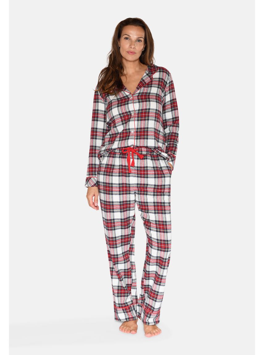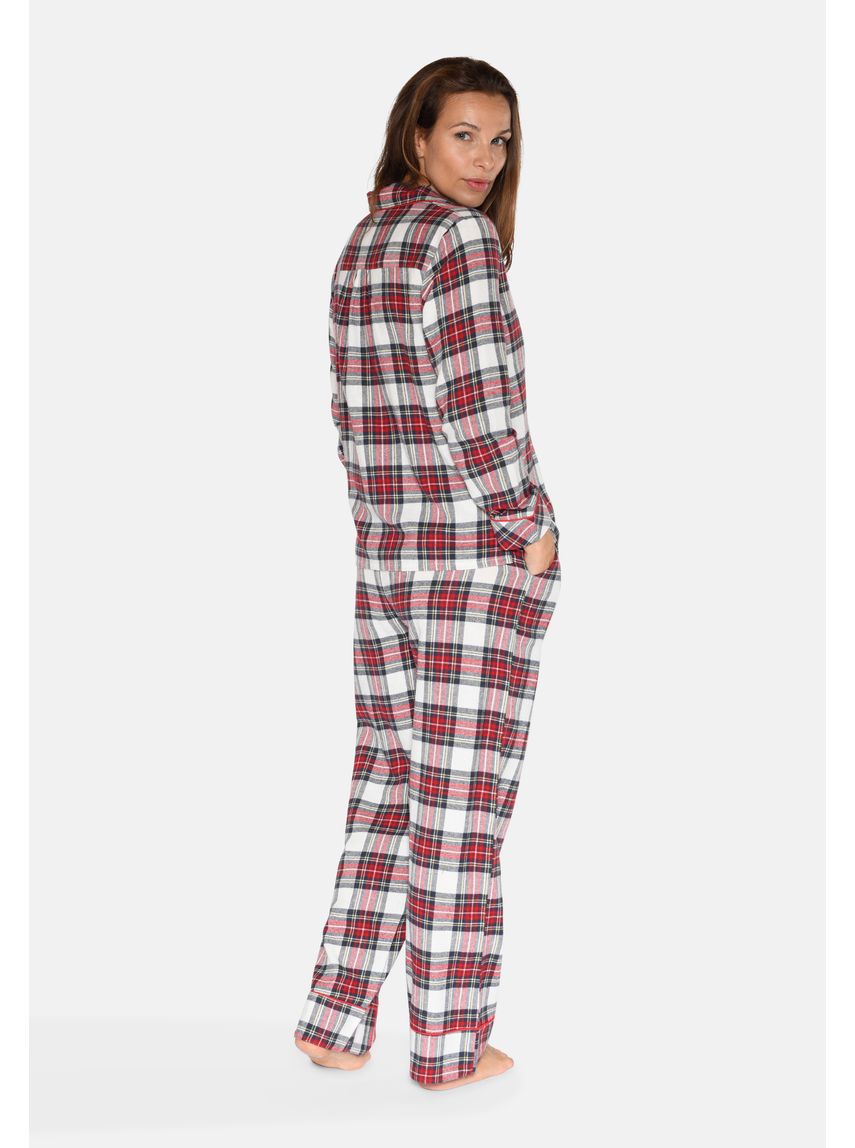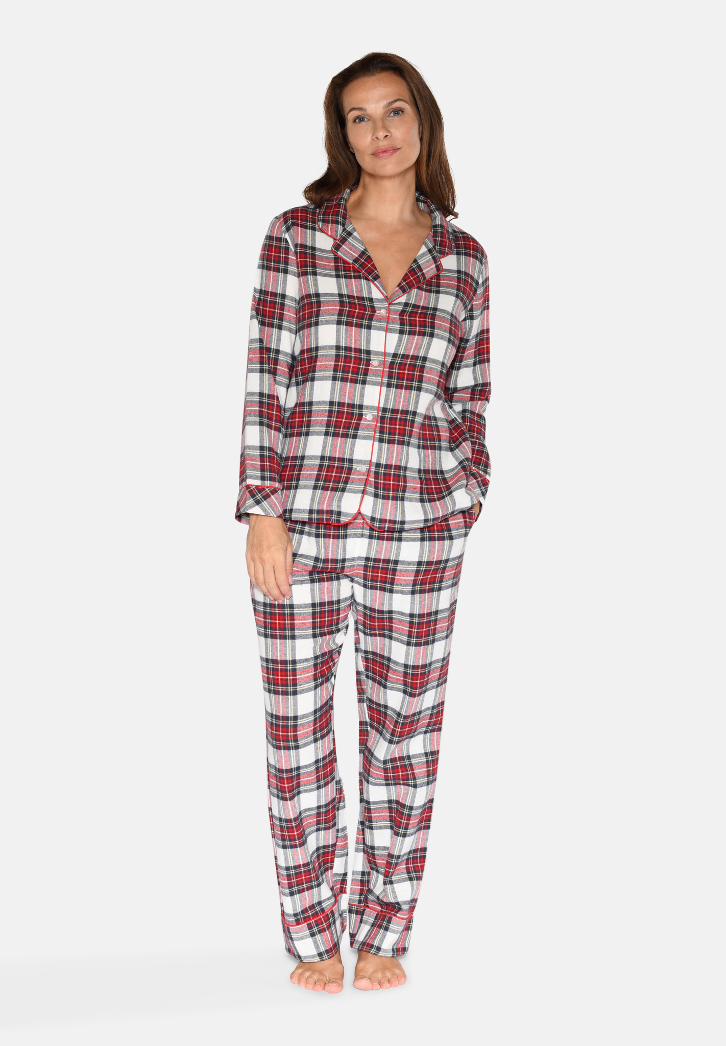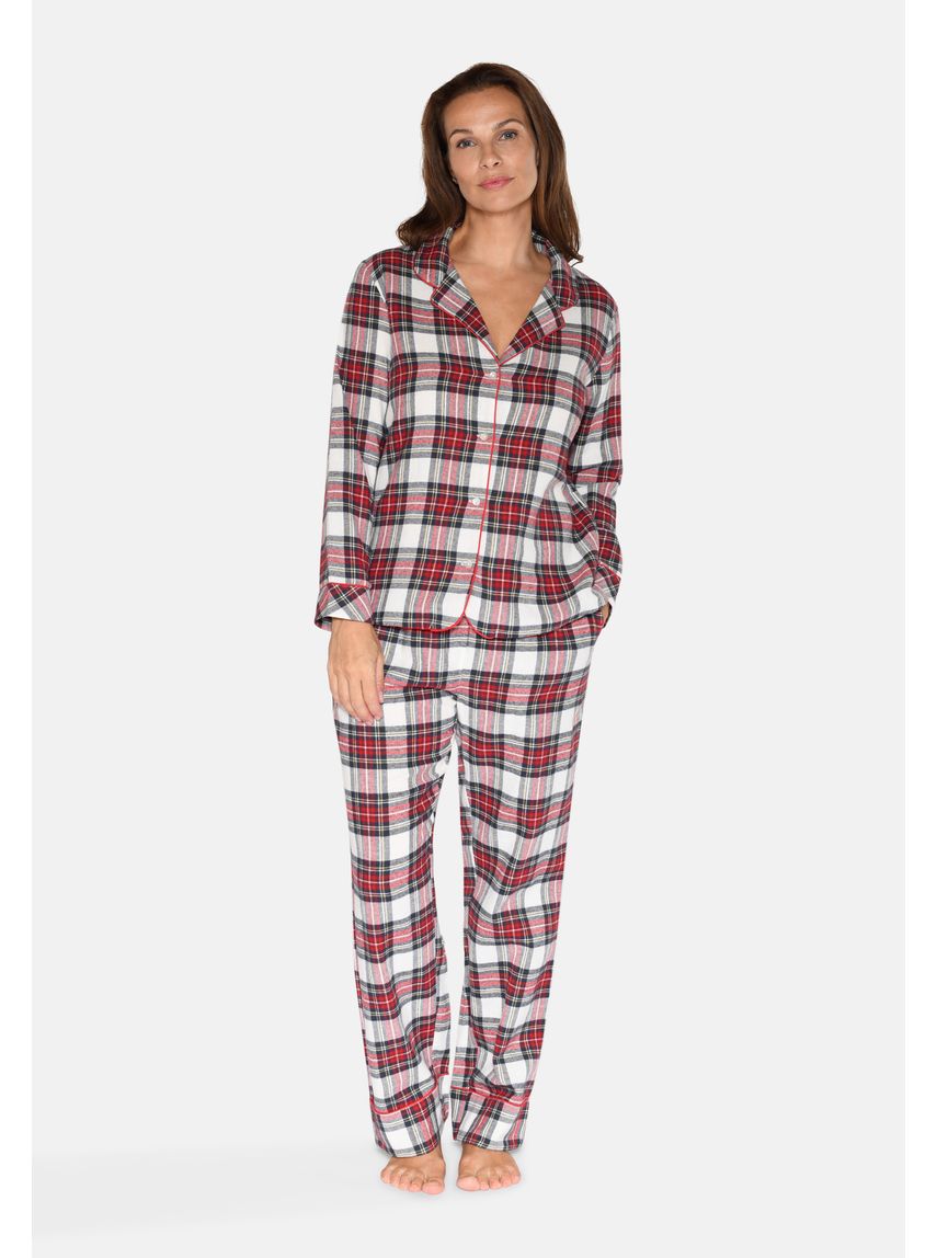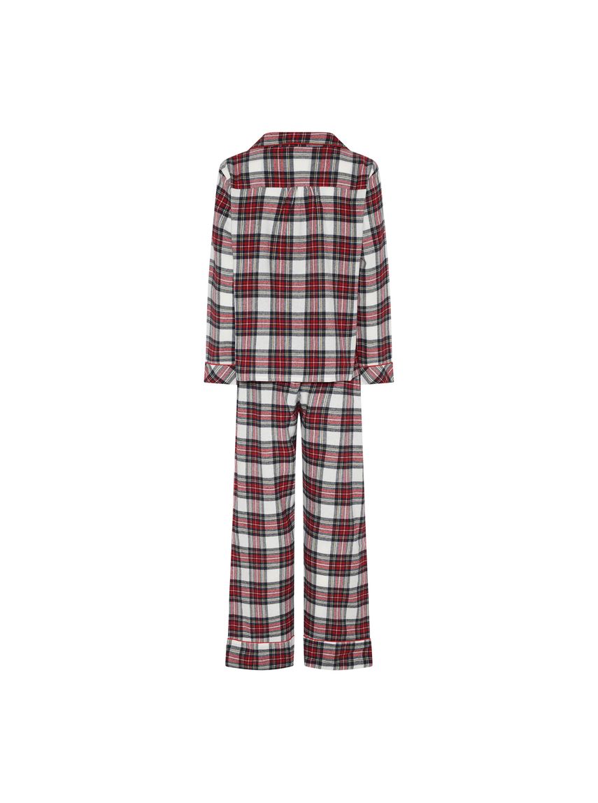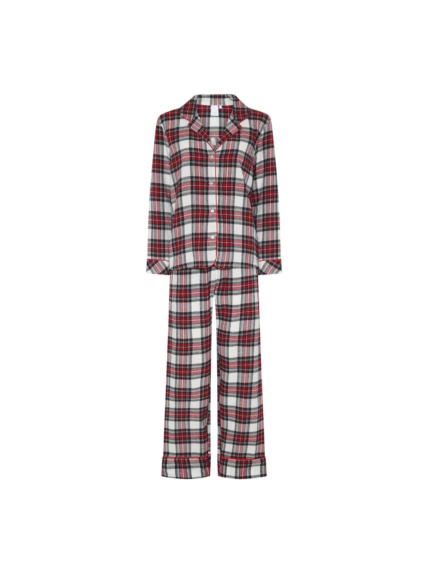 Hvít í grunninn með rauðum, grábláum og gulum köflum.
