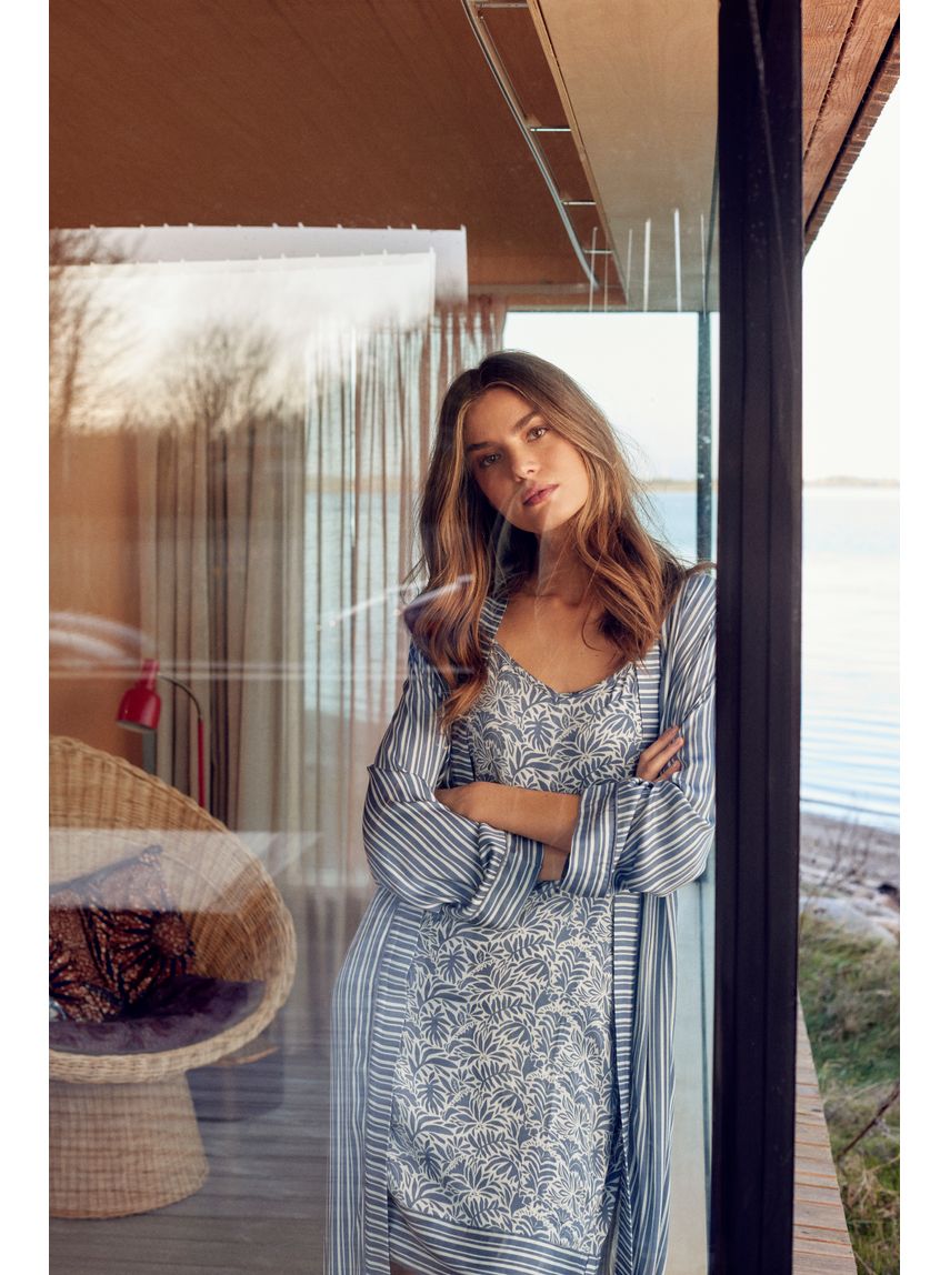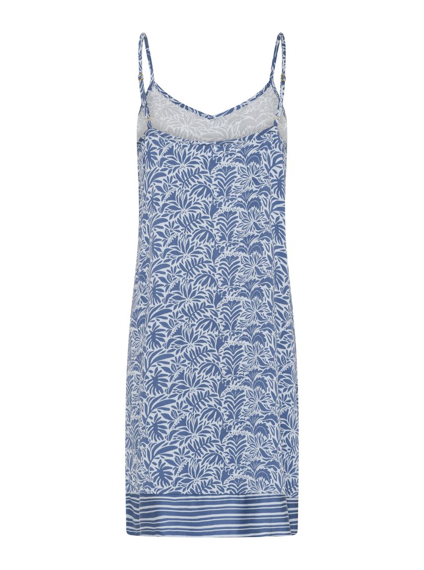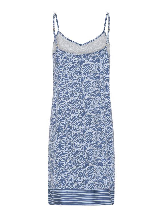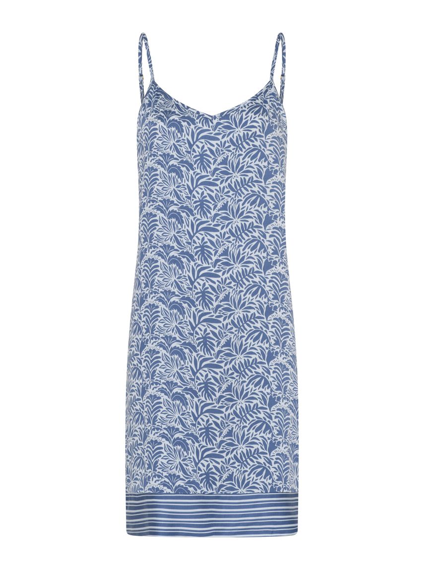 Ljósblár í grunn með dekkra bláu plöntumynstri.