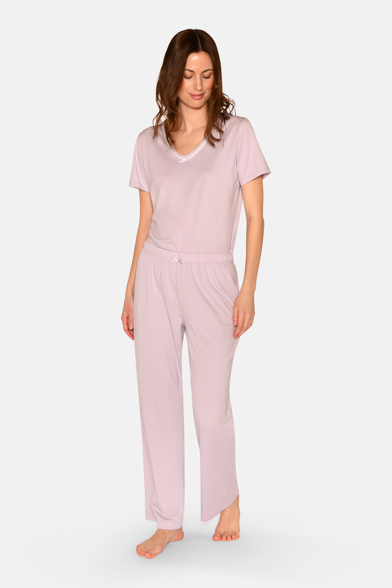 Mjúk teygja í mitti með lítilli slaufu að framan.