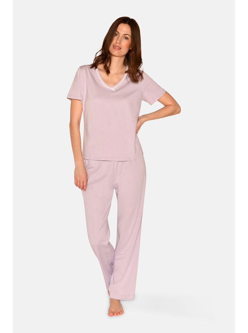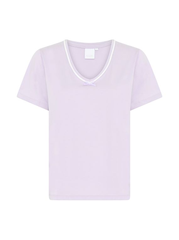 V-hálsmál með hvítu miðseymi og lítilli slaufu.