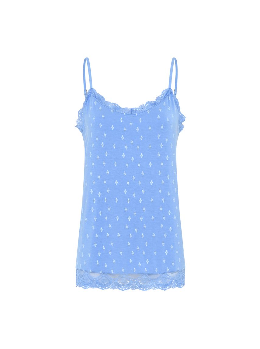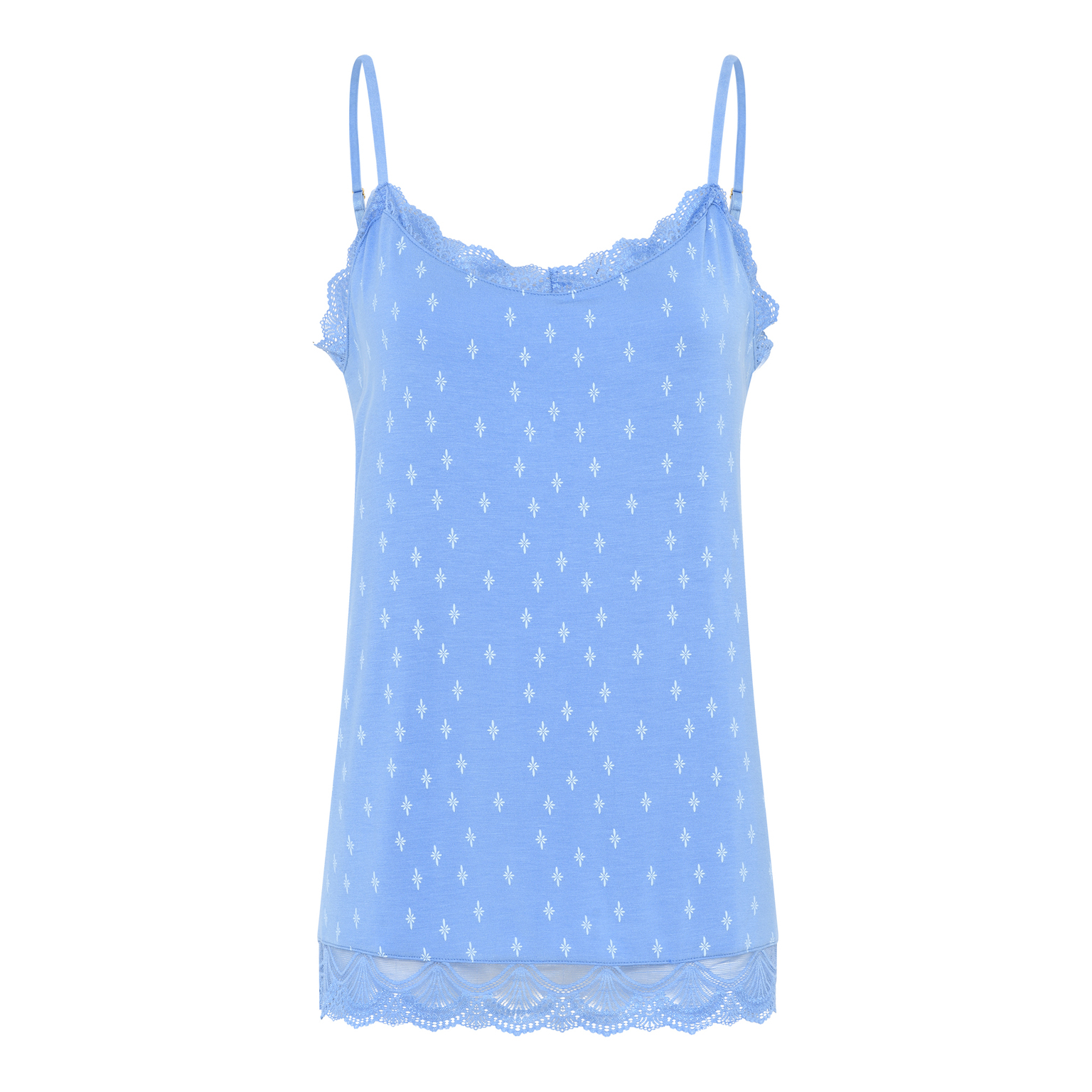 Fínleg blúnda í hálsmáli og breið blúndulíning neðst á bol.