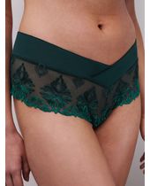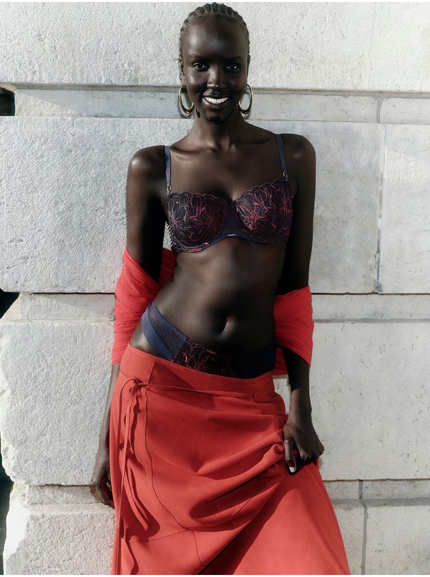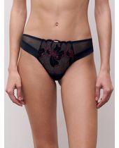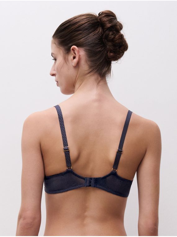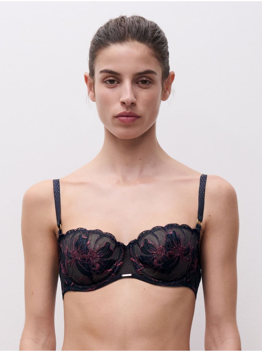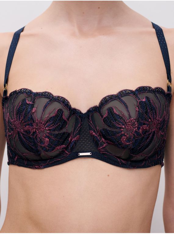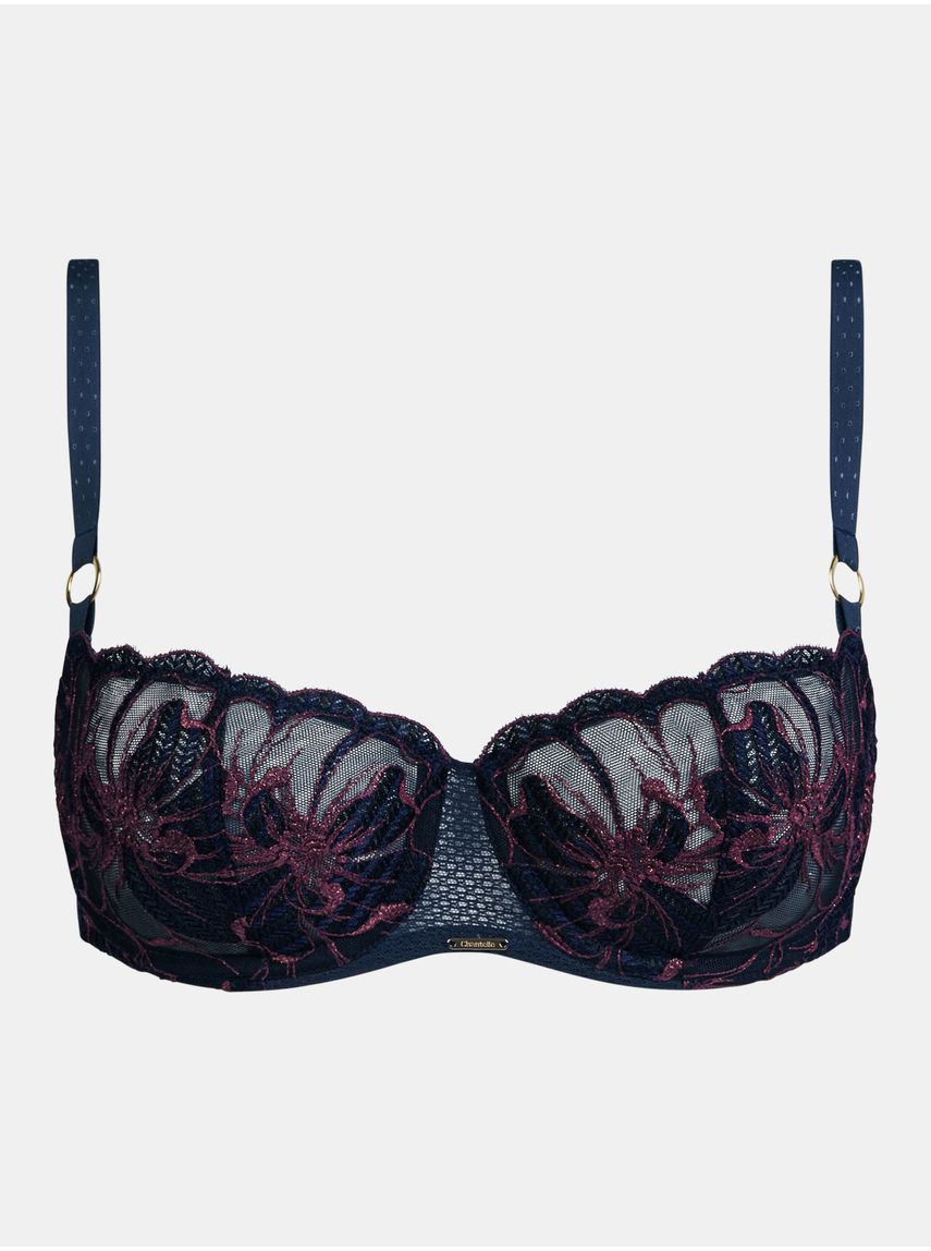 Glæsilegur dökkblár og fjólurauður brjóstahaldari í balcony sniði úr Fleurs línunni frá Chantelle.