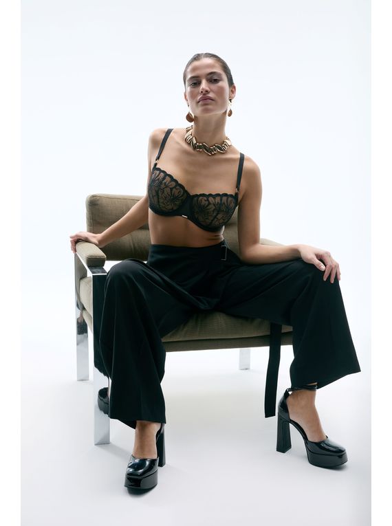 Glæsilegur svartur brjóstahaldari í balcony sniði úr Fleurs línunni frá Chantelle.
