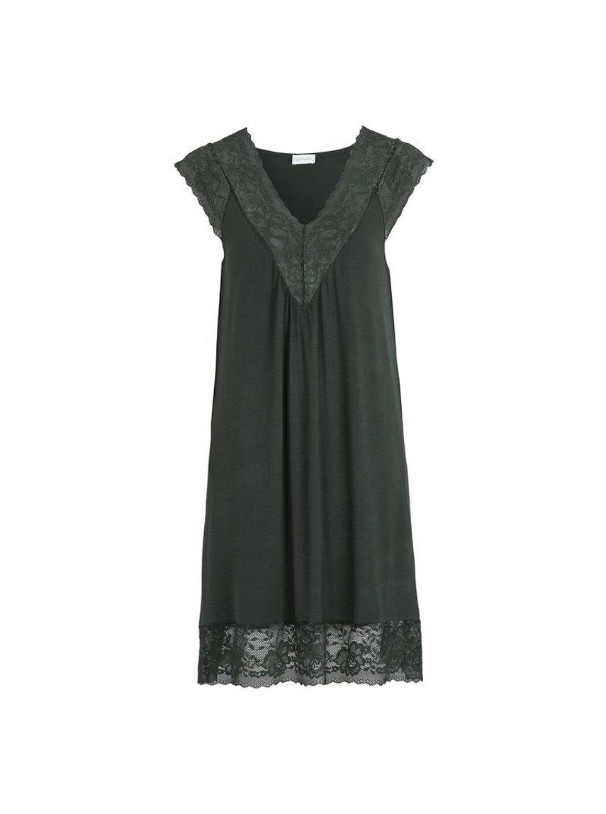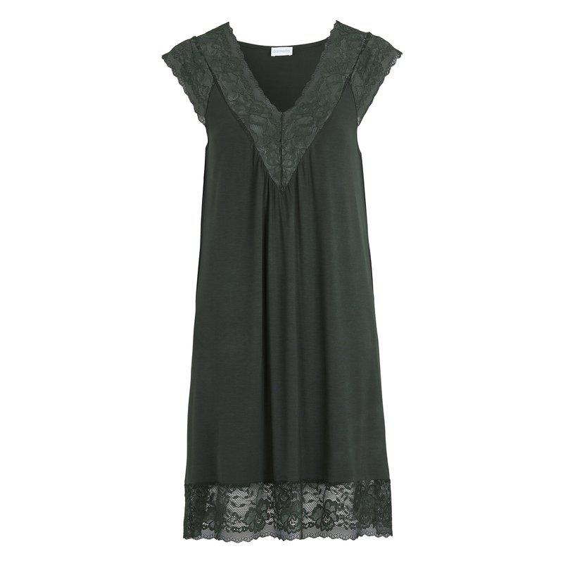 Hnésíður náttkjóll úr viscose, frá Damella. Skógargrænn litur með breiðri mjúkri blúndu í V-laga berustykki, yfir axlir og neðan á kjól. Rykking er undir blúndu í berustykki.