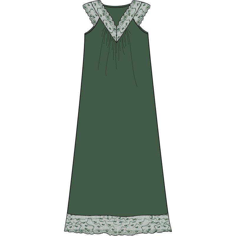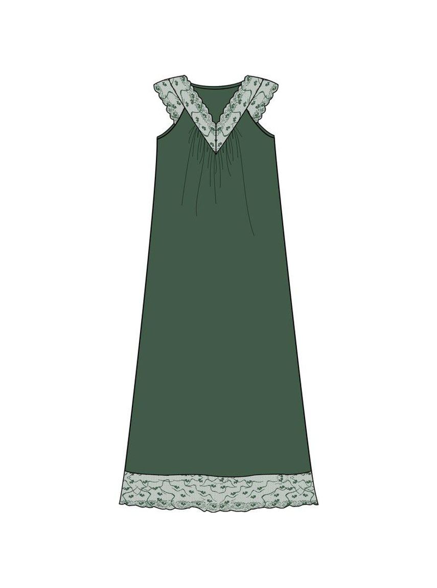 Síður náttkjóll úr viscose, frá Damella. Skógargrænn með breiðri mjúkri blúndu í V-laga berustykki, yfir axlir og neðan á kjól.