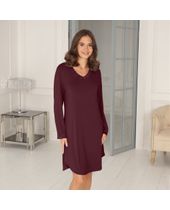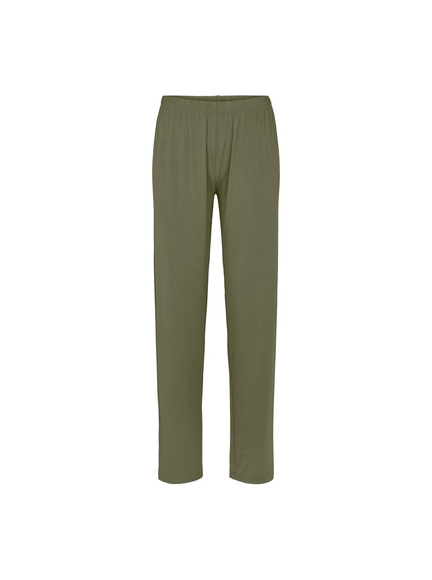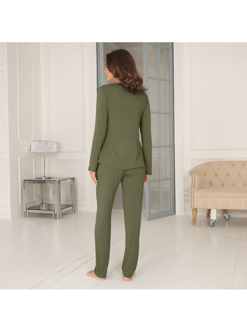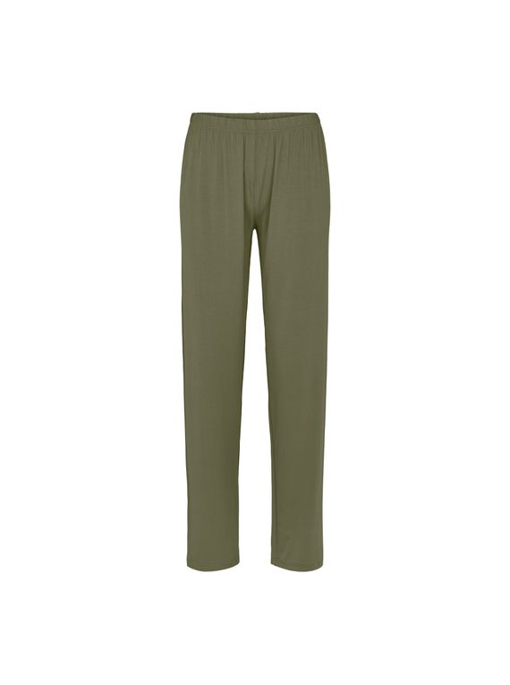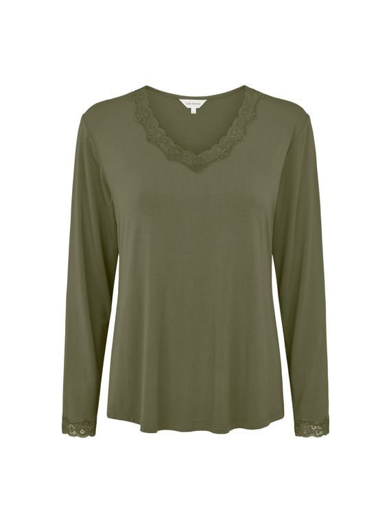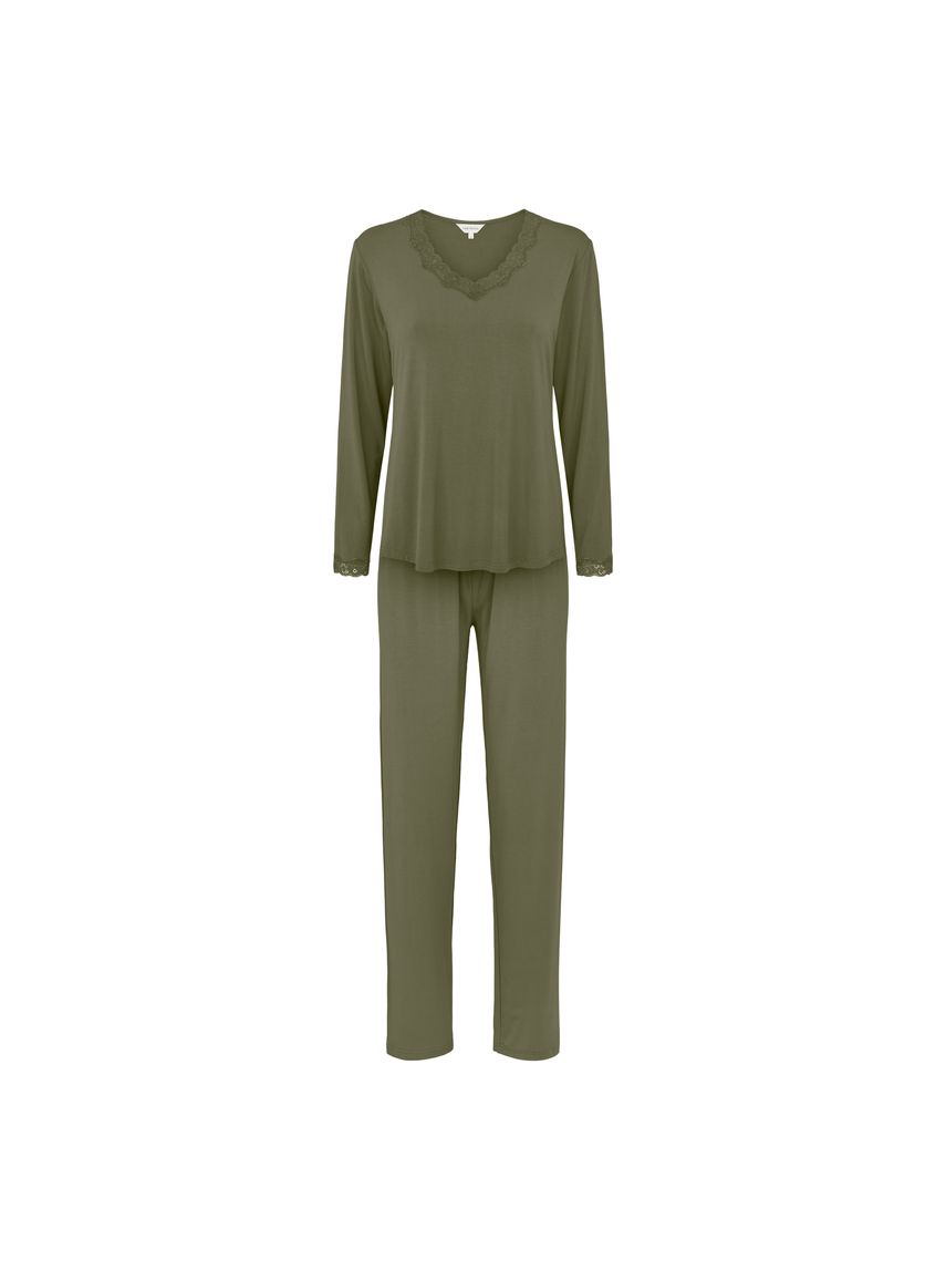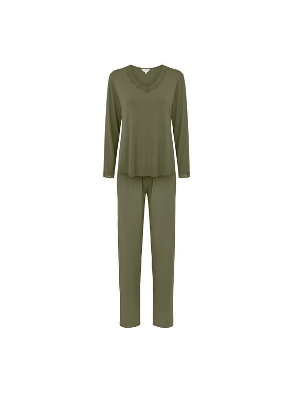 Síðar buxur með mjúkri teygju í mittið og síðerma bolur með fínlegri, mjúkri blúndu í V-laga hálsmáli og neðan á ermum.