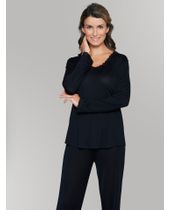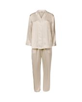 Síðar buxur með mjúkri teygju í streng og hneppt síðerma skyrta með kraga í hálsmáli.