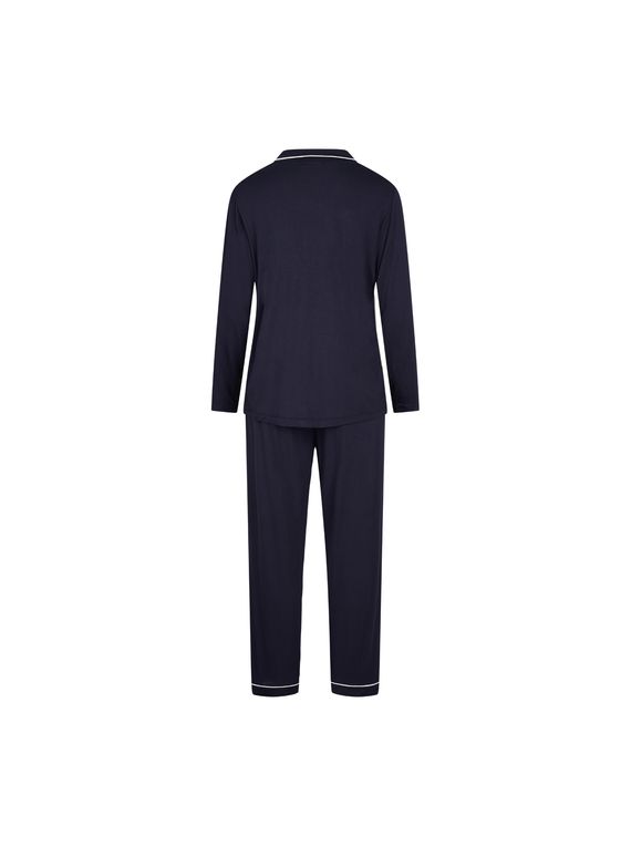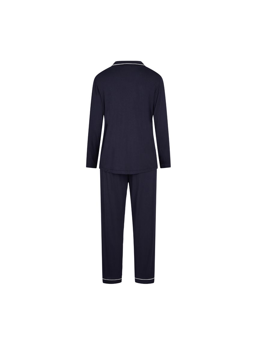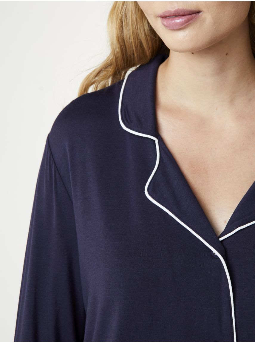 Skyrtan er með hvítt miðseymi og er hneppt að framan.