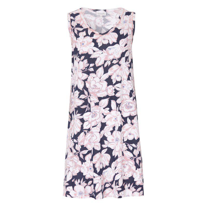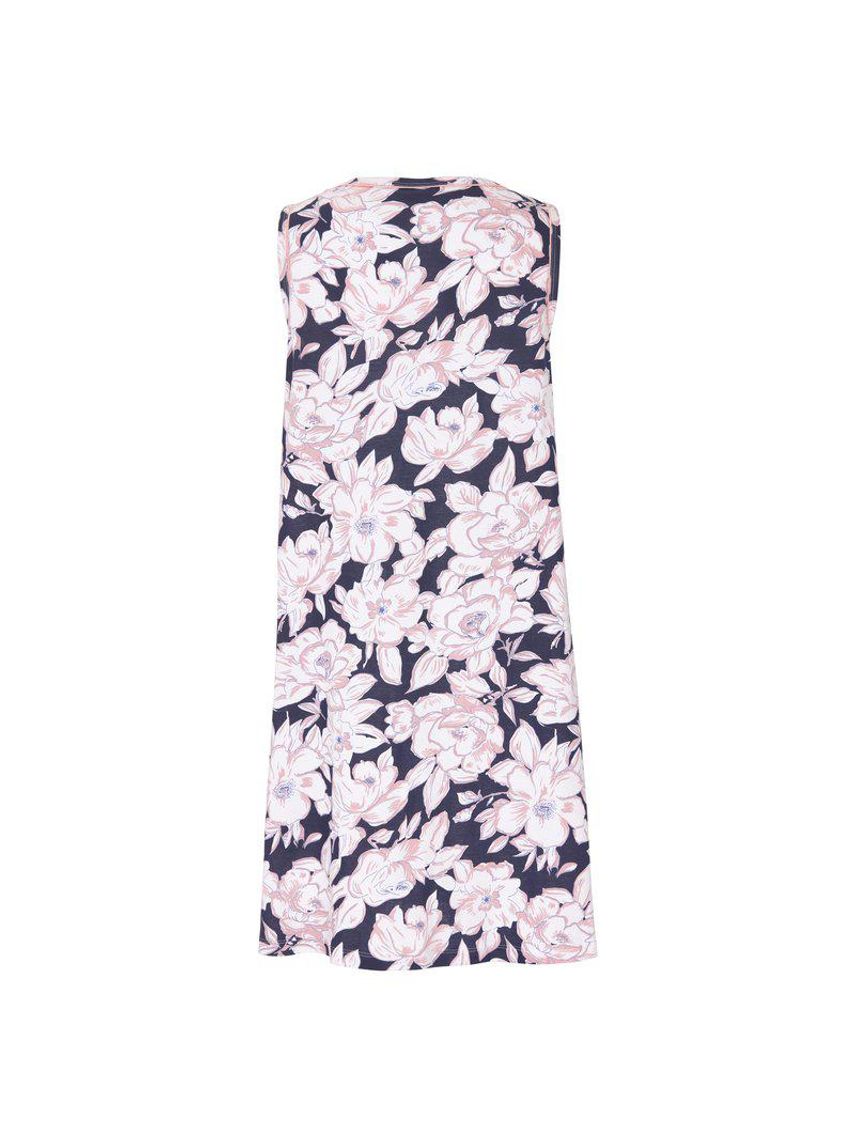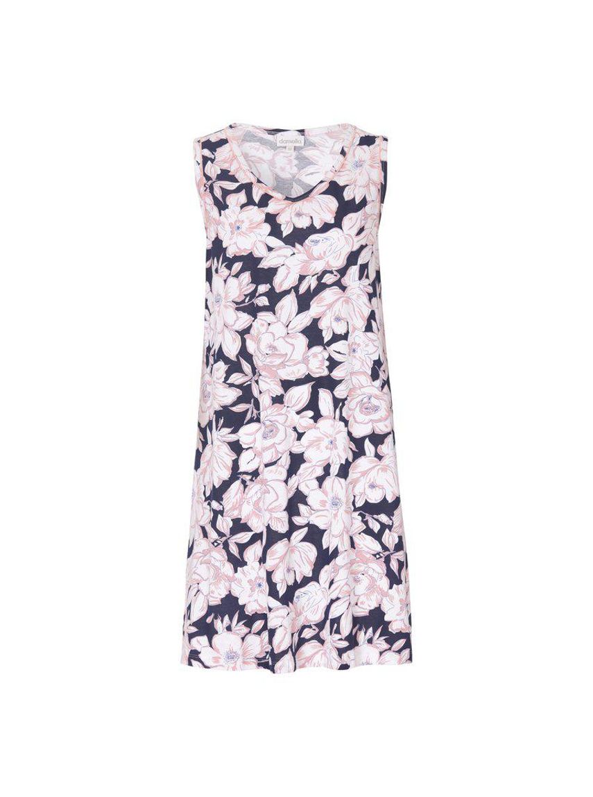 Dökkblár í grunninn með kóralbleiku og hvítu blómamynstri.