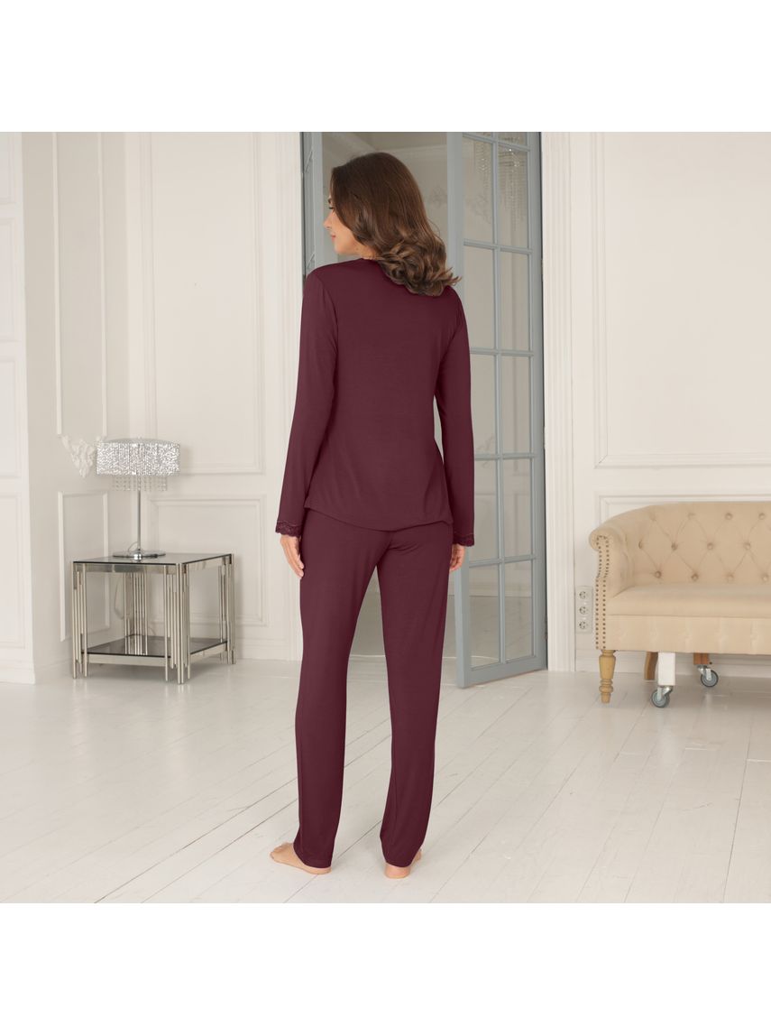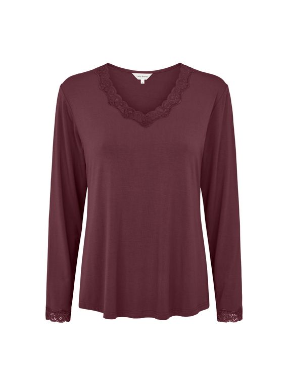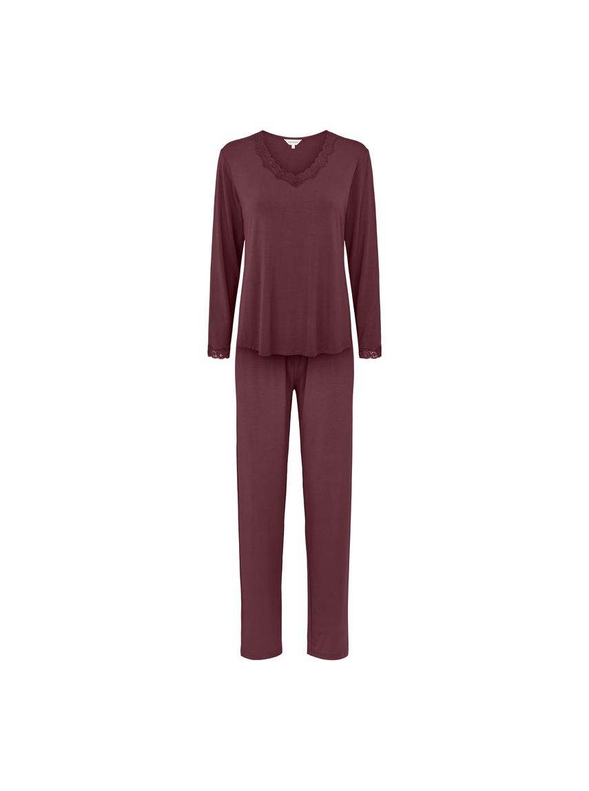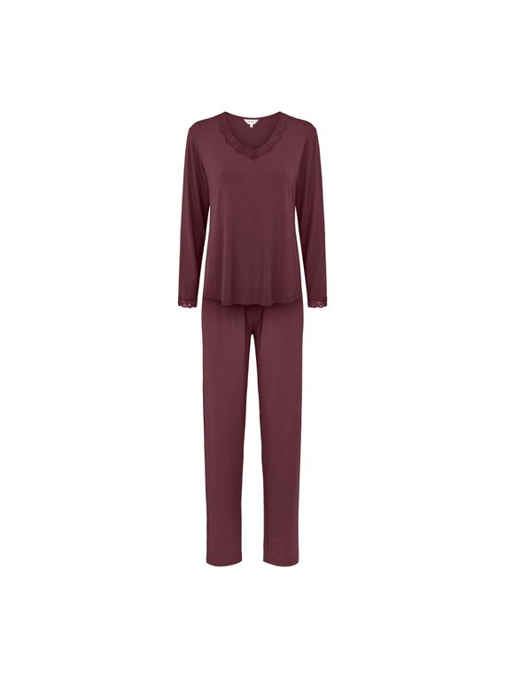 Síðar buxur með mjúkri teygju í mittið og síðerma bolur með fínlegri, mjúkri blúndu í V-laga hálsmáli og neðan á ermum.