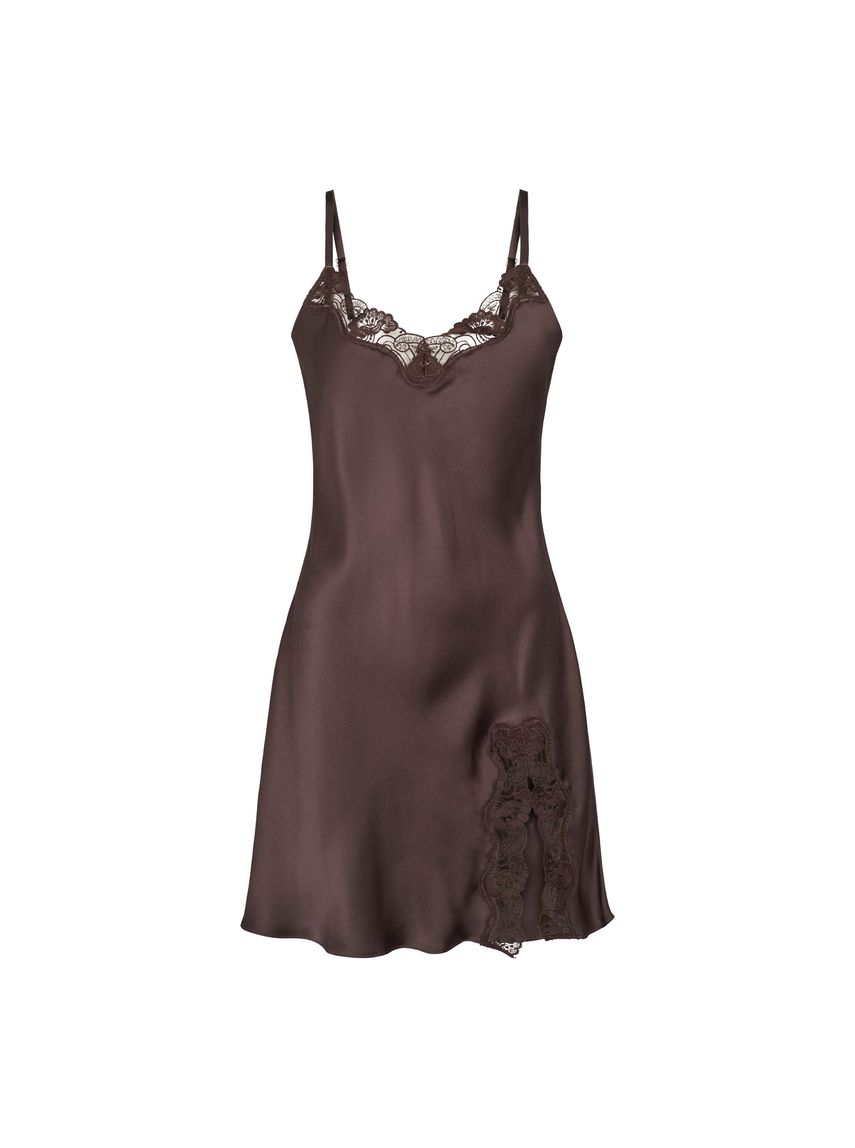 Kaffibrúnn, sídd niður að hnjám, mjóir stillanlegir hlýrar og klauf að neðan vinstra megin.