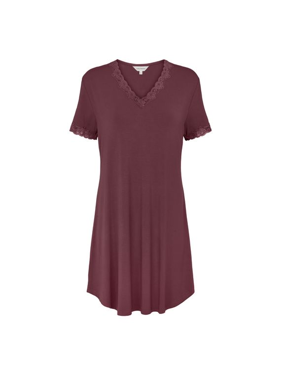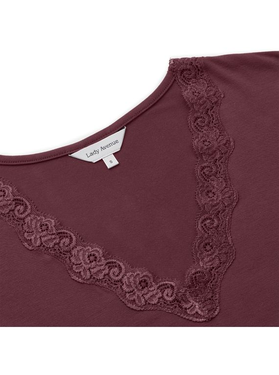 Kjóllinn er með stuttum ermum og mjúkri, fínlegri blúndu í V-laga hálsmáli og á ermum.